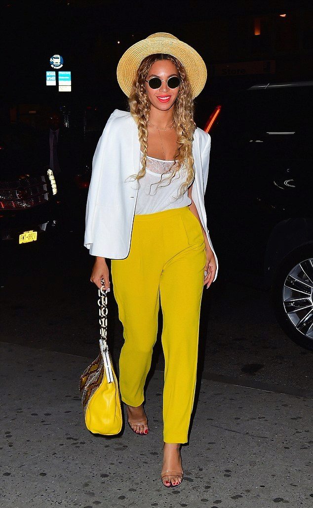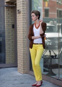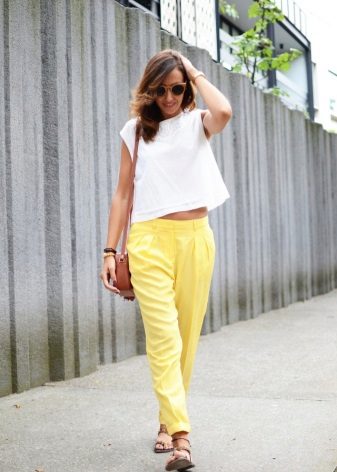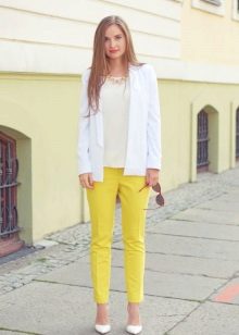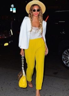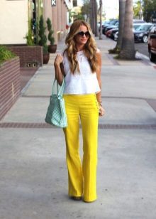 The choice of shades of yellow depends largely on the appearance of the girl. So, the fair-skinned woman with fair skin should pick up a pale yellow trousers and a soft top. Owners of dark skin can wear a model of a bright yellow color in tandem with a bright or neutral top. Light yellow pants will look beautiful on girls with a light tan. A white blouse will add elegance and style to your look.