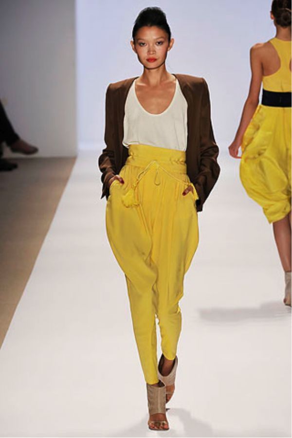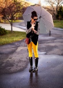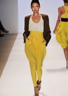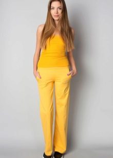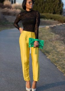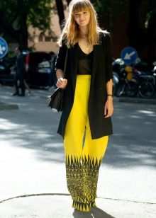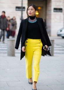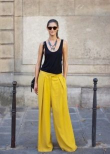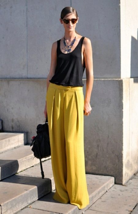Wide yellow pants are a fairly common model, because they are fashionable to wear even to work. An excellent addition will be a black blouse, decorated with a yellow print. Young people often give preference to precisely broad models.