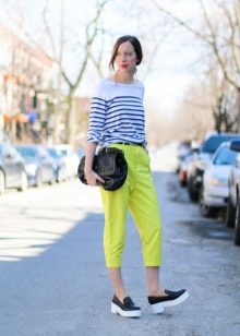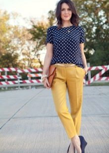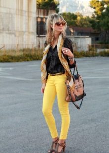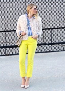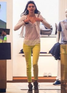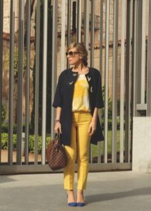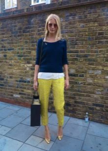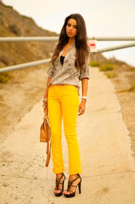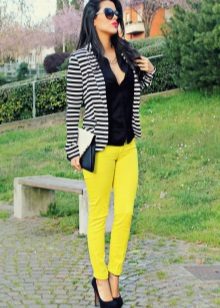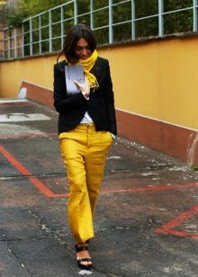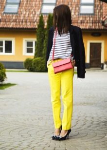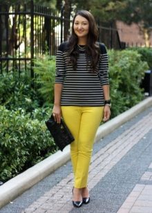 In combination with strict riding in yellow skinny pants, you can go to school. For the embodiment of office style, yellow trousers-pipes, models of narrowed shortened style, as well as straight trousers with arrows are suitable.