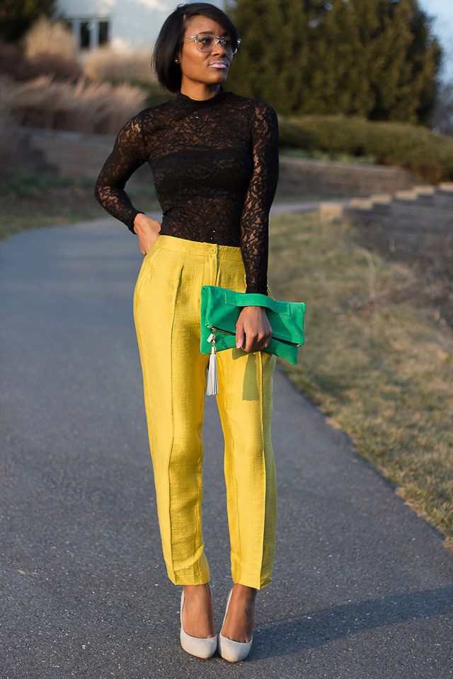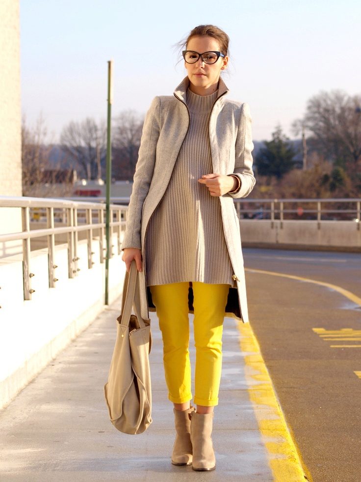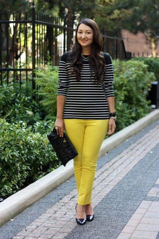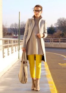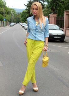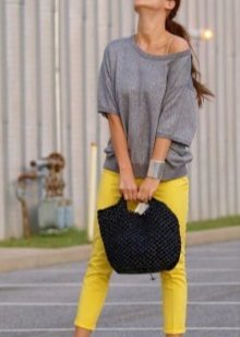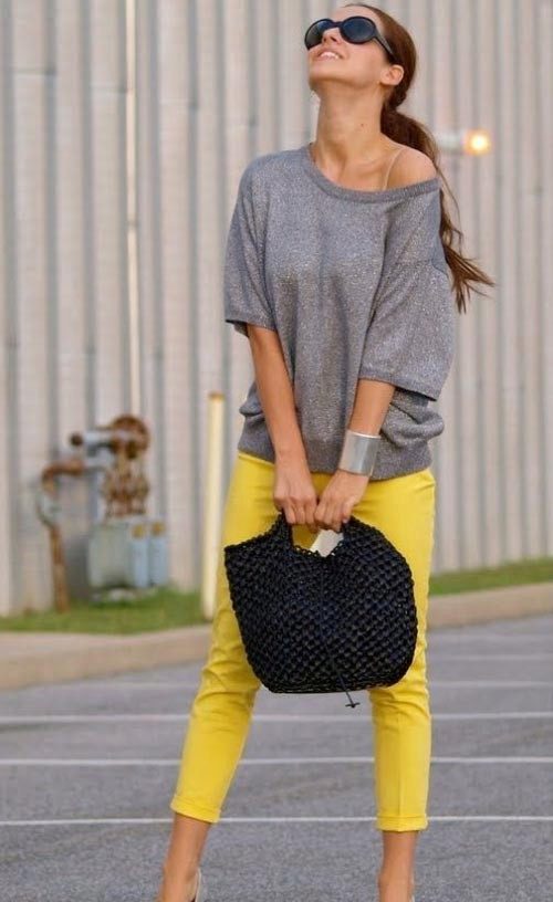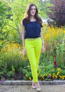 Women's yellow pants blend harmoniously with classic black and white, but this variety does not end there. These pants can be combined with things blue, gray or beige. The combination of yellow with red or green looks bright and saturated.