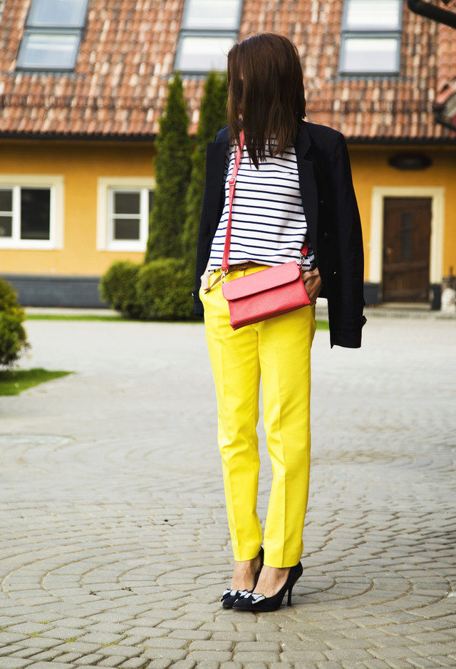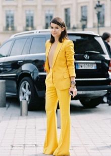 Only courageous women of fashion can combine top and bottom of yellow color. This outfit should be decorated with accessories of neutral tones and black or cream-colored shoes.