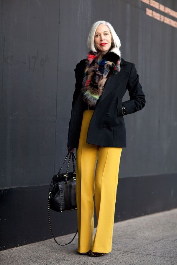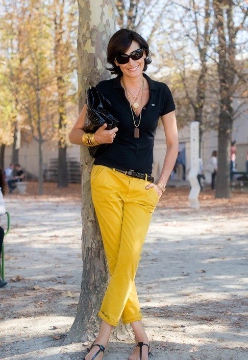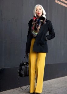 Yellow pants look great in tandem with a black top. For a cool evening suit black jacket with a soft print. Even women after 40 can afford such an outfit. Another option is a short-cut white jacket over a black top and comfortable ballet flats to match the top.