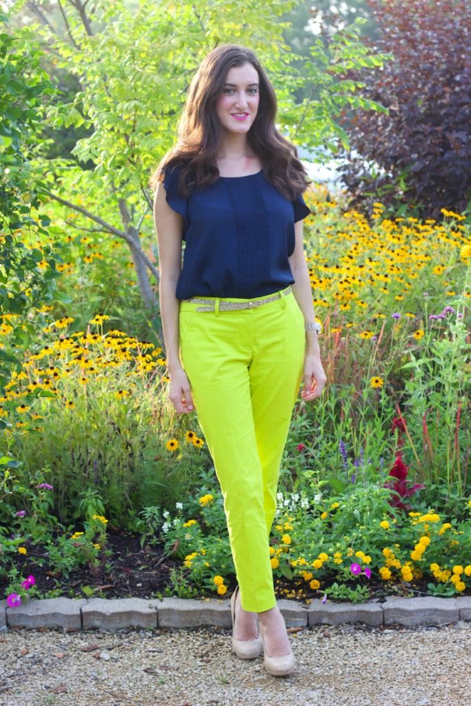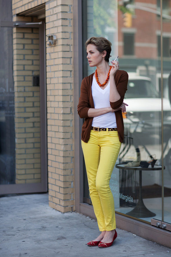 Ballet flats or beige court shoes are suitable for a business look. Gray or blue shoes can also be combined with yellow pants, but then the top should also be presented in gray or blue. Black shoes are not very in harmony with the yellow color, so it can be worn only if your image has a black top.