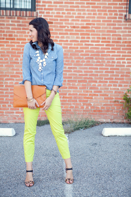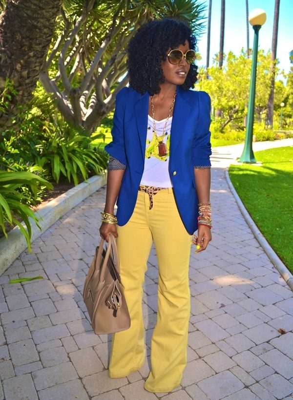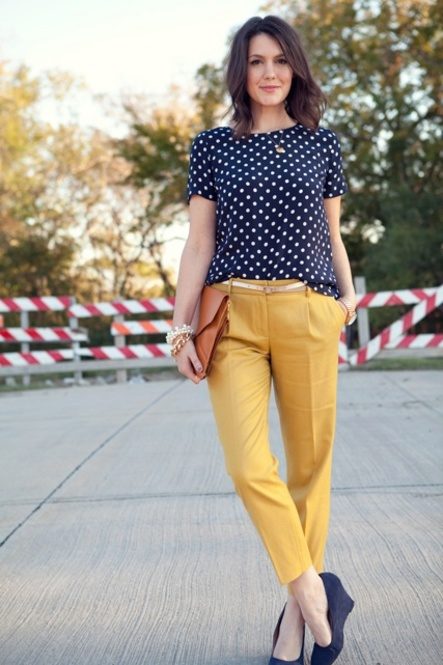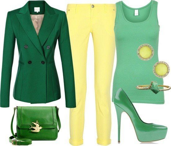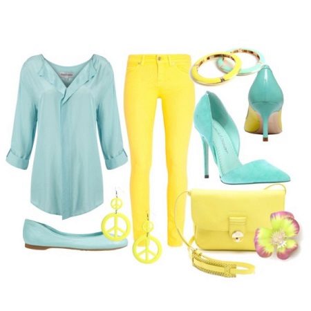 The summer version is a combination of yellow and turquoise. A yellow turquoise blouse with a 3/4 sleeve and shoes of the same color will look great with yellow tapered trousers. Handbag and accessories should be combined with one of these basic colors.
