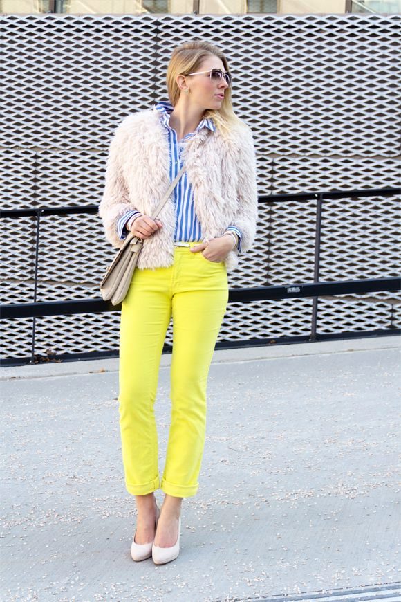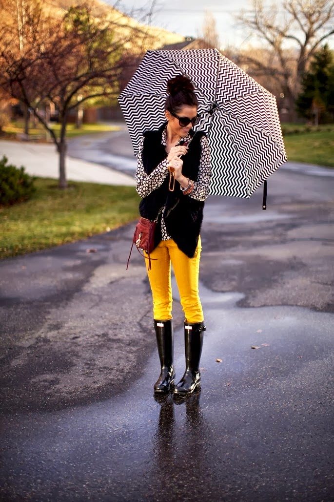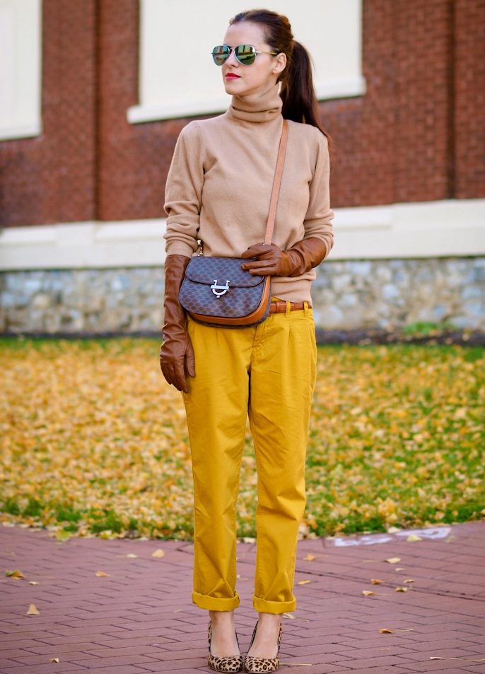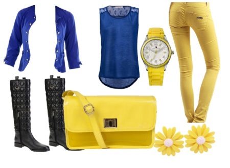 To create a stylish fall look, yellow pants are a good choice. They can be worn with a blue tunic and jeans of the same color. From shoes you can wear black leather boots without a heel, and from the accessories you can choose a yellow watch and a handbag that perfectly complement this bow.