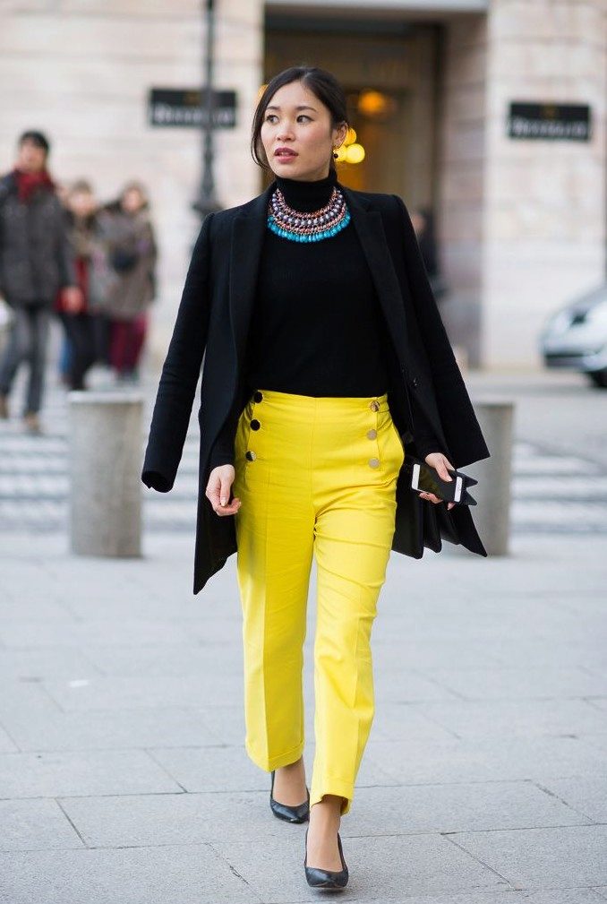 To embody office style, yellow pants can be combined with an elegant white cardigan and classic pumps. The combination of black turtleneck and classic shoes is a win-win option to create a business bow in tandem with yellow pants.