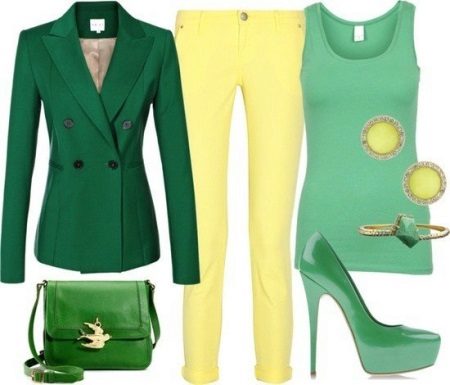 The combination of green and yellow always looks fashionable and fresh, while it is ideal for translating the image of a business lady. With yellow pants, narrowed cut, you can wear a fitted green T-shirt without any details and prints. A dark green double breasted blazer will look great on top of a vest. When choosing accessories, you should give preference to a dim and sophisticated bracelet and earrings, which are perfectly combined with the image in color. A small bag and high-heeled shoes to match the jacket ideally complement a beautiful bow.