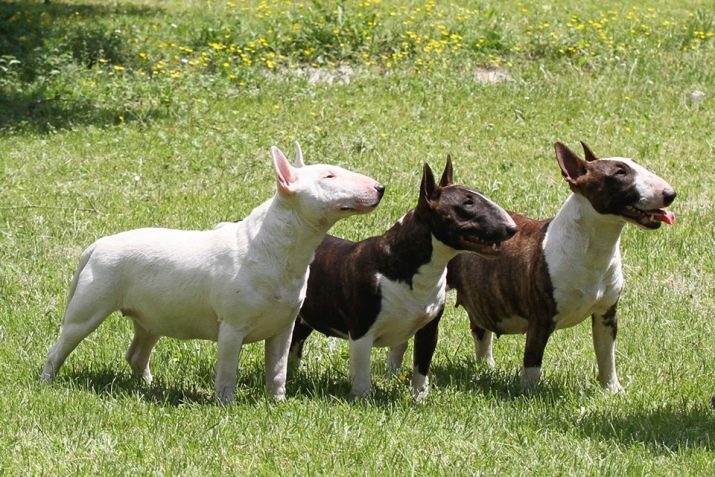 The head of the bull terrier is large, with a flat forehead, passing without drops in a long, slightly hook-nosed face. Small dark brown eyes in the form of triangles are significantly recessed into the sockets of the skull. Narrow small triangular-shaped ears stand high and at a short distance.