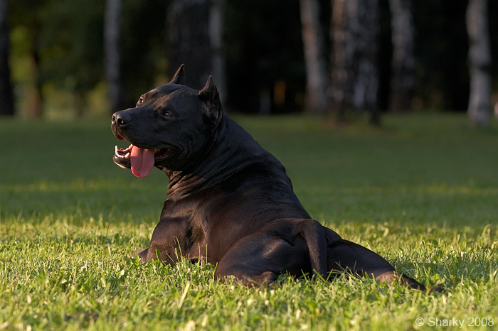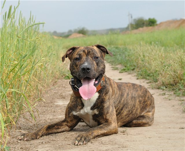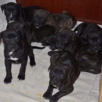 The average size of individuals is from 44 to 49 centimeters, females are usually smaller than males. The coat is rather short and smooth. The torso is very powerful and muscular. Oval eyes are planted not too deep and can have shades from pale blue to yellow or saturated brown. The jaws are very strong for the dog, a characteristic feature is the enormous difficulty to unclench them if the dog entered the fight.