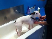 The care of the bull terrier's oral cavity will also fall on the owner's shoulders. You can take a regular brush, but you should buy a “dog's” paste, and it is easy to find such a tool. The fangs are cleaned weekly, and, if for some reason the animal has disliked the brush, there are also attachments to the finger in the assortment of pet shops.