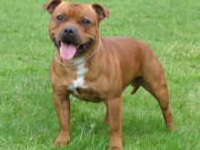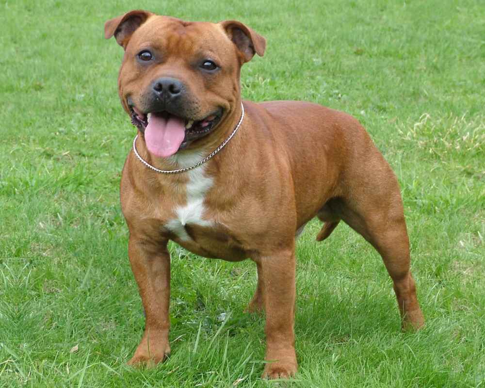 - The Staffordshire breed is more sedate and slower, the muzzle resembles a bulldog. It was bred by crossing a bulldog and a terrier. It can have different types of color, very common tiger, brown and red color.