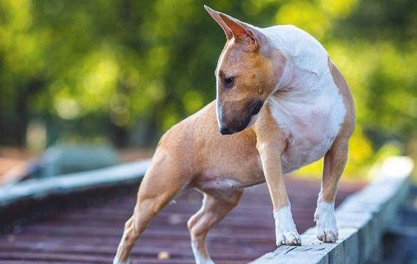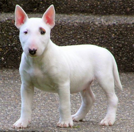 - The English bull terrier is most often white, this dog is light, agile. It was obtained by crossing a Dalmatian, a terrier and a bulldog.