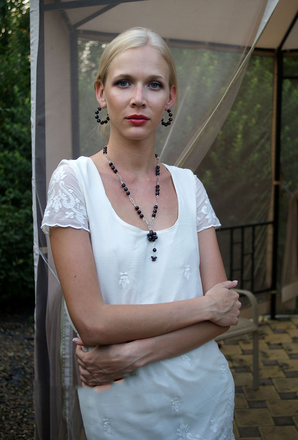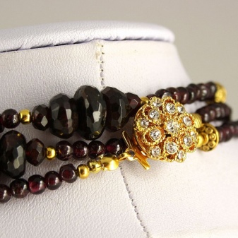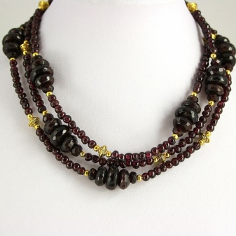 - It is worth remembering that putting on garnet beads, you should refuse any other jewelry. This is especially true of gold and silver earrings. Only different accessories containing one stone will look harmoniously.