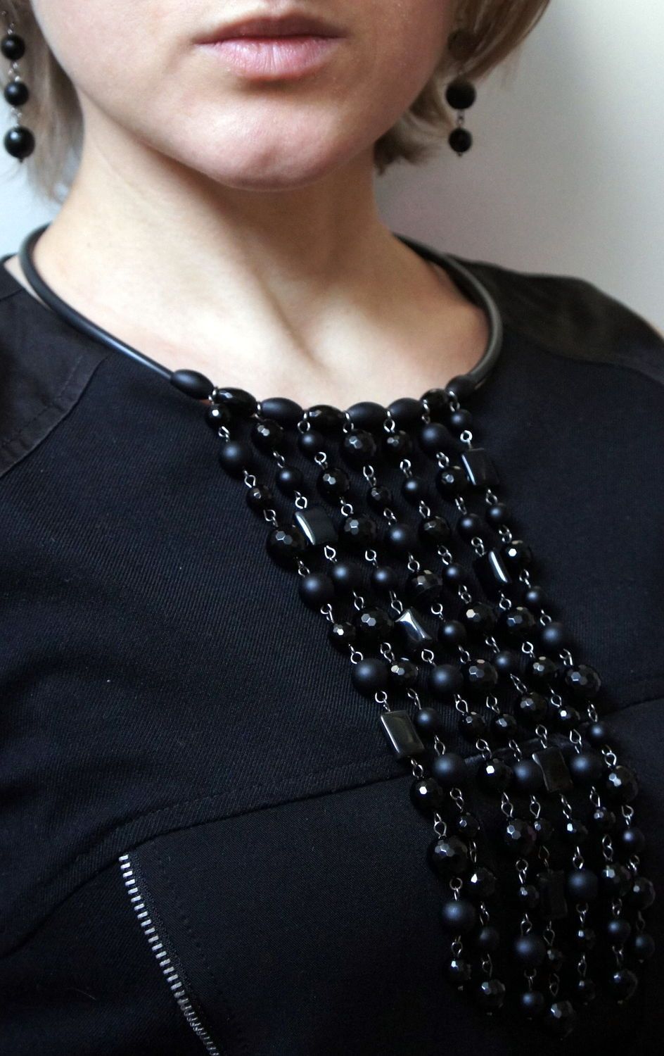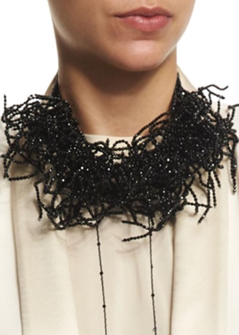 For an evening out, you need to use a wardrobe that will not distract attention from the beads. If a short necklace is worn, the neckline of the dress should be small. But to the long beads you can choose an outfit with a deep neckline.