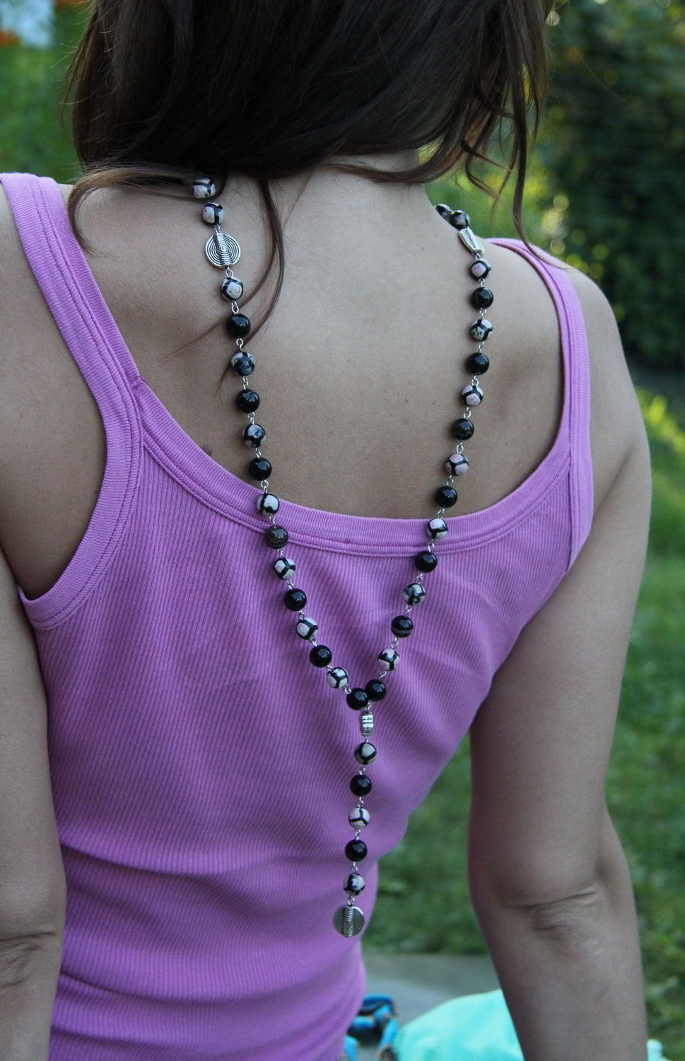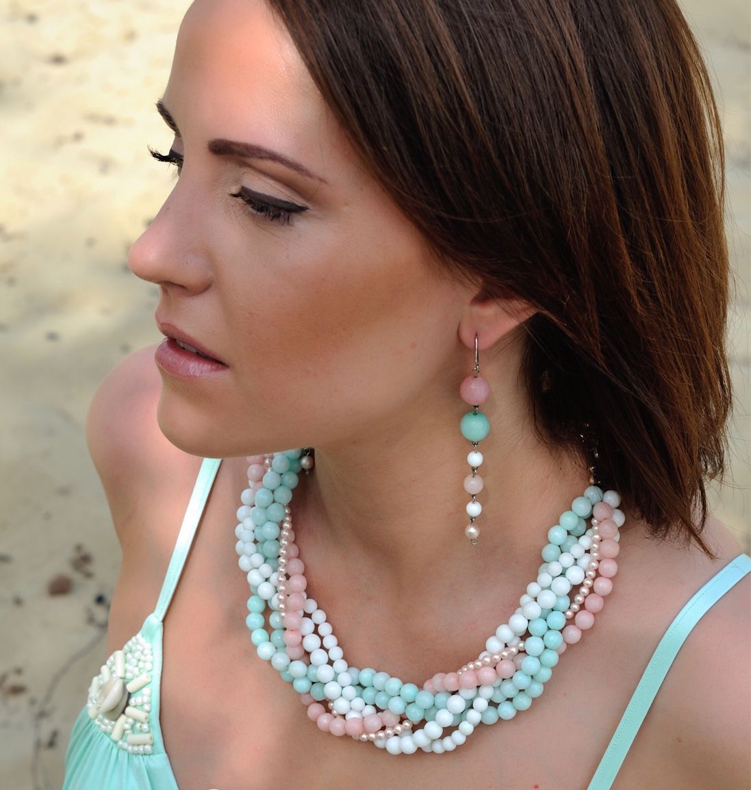 Dress safari, tankettes will be in perfect harmony with green-brown agate beads. By creating such an ensemble, you can go anywhere. For a romantic date you need to use beads of light shades.