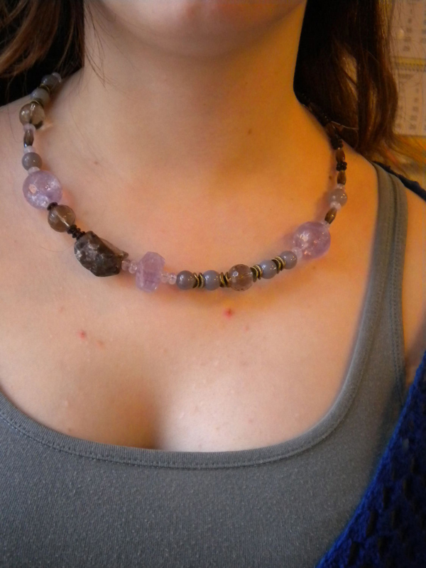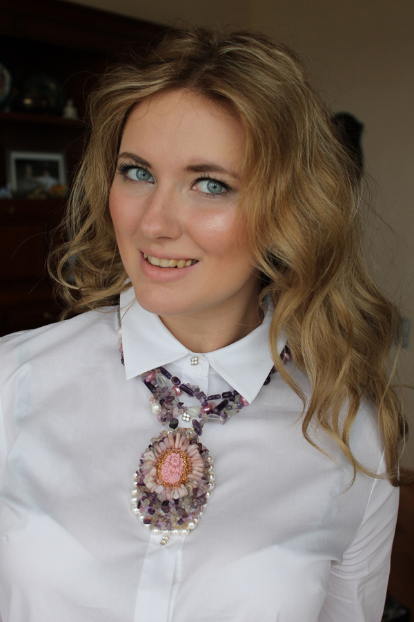 Gemstone beads are best used in combination with comfortable, unobtrusive clothing of cold colors in order to avoid color conflict. Amethyst is a calm stone, and bright clothes can ruin the whole look. So before you put on mineral beads, you need to work carefully on the image.