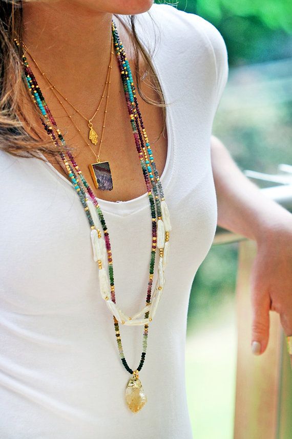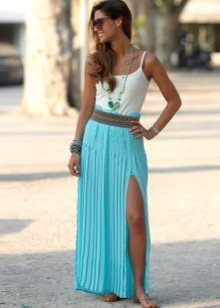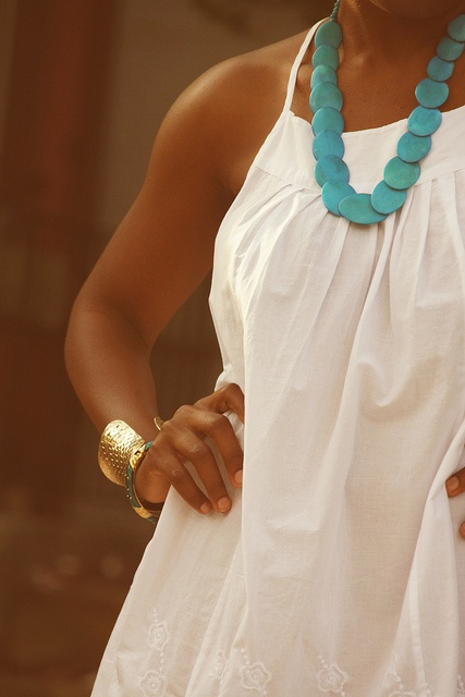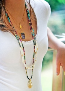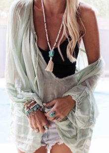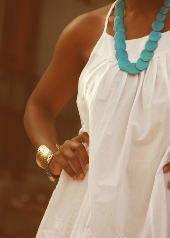 - Light summer dress with wide straps will be combined with narrow and long beads. Or beach outfit with thin straps.