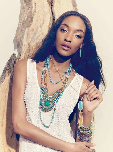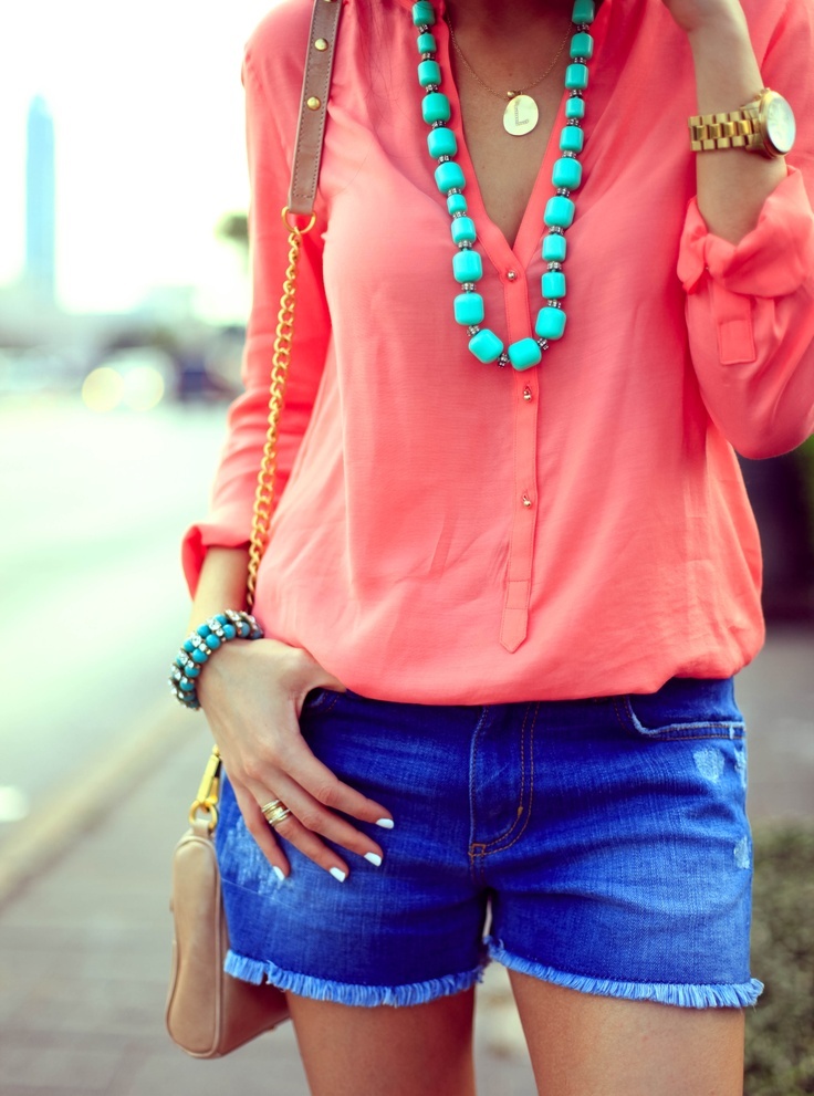 - Cocktail dark dress with open shoulders can be complemented with beautiful turquoise beads in two rows. This ensemble once chose Megan Fox to enter the red carpet.