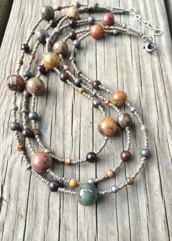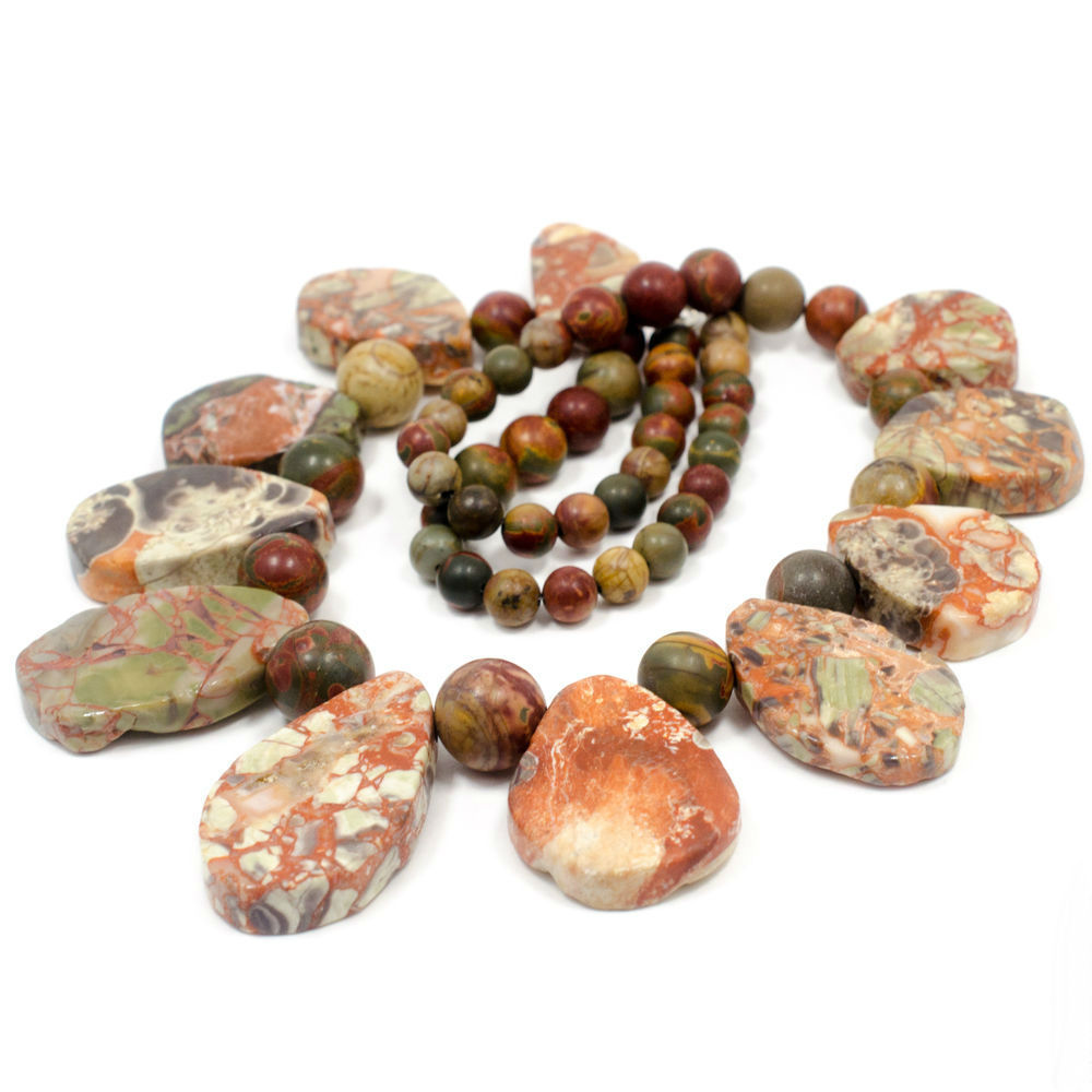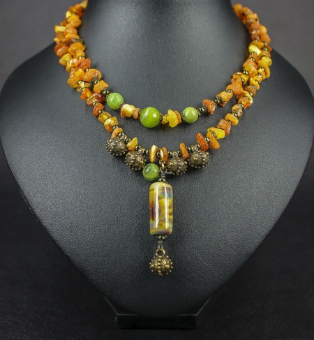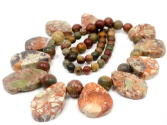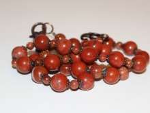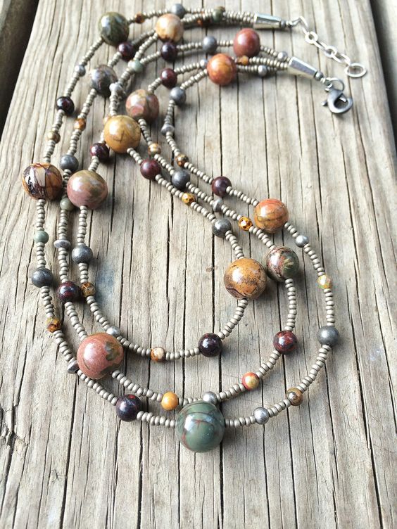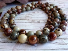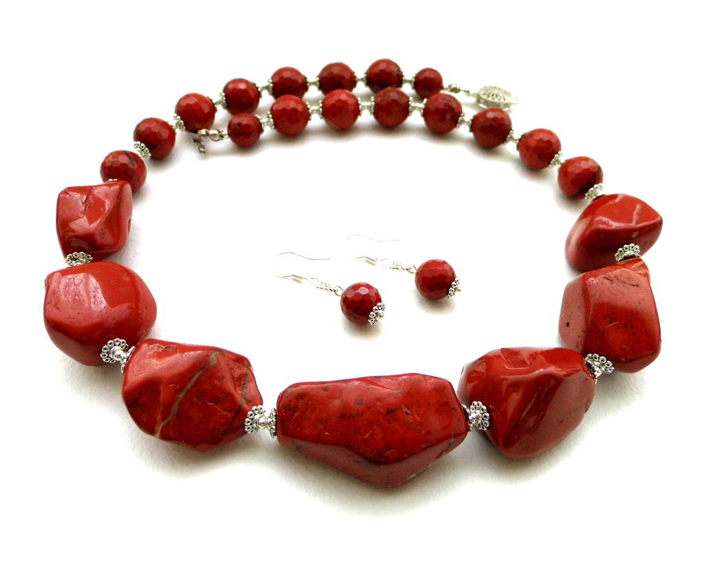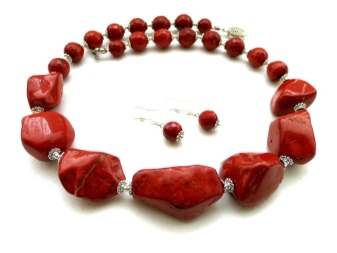 Beads, in which jasper is combined with other stones, look unusual and very textured. Such jewelry will harmoniously fill the open neckline area and, in combination with earrings from the same set, will add a zest to the image.