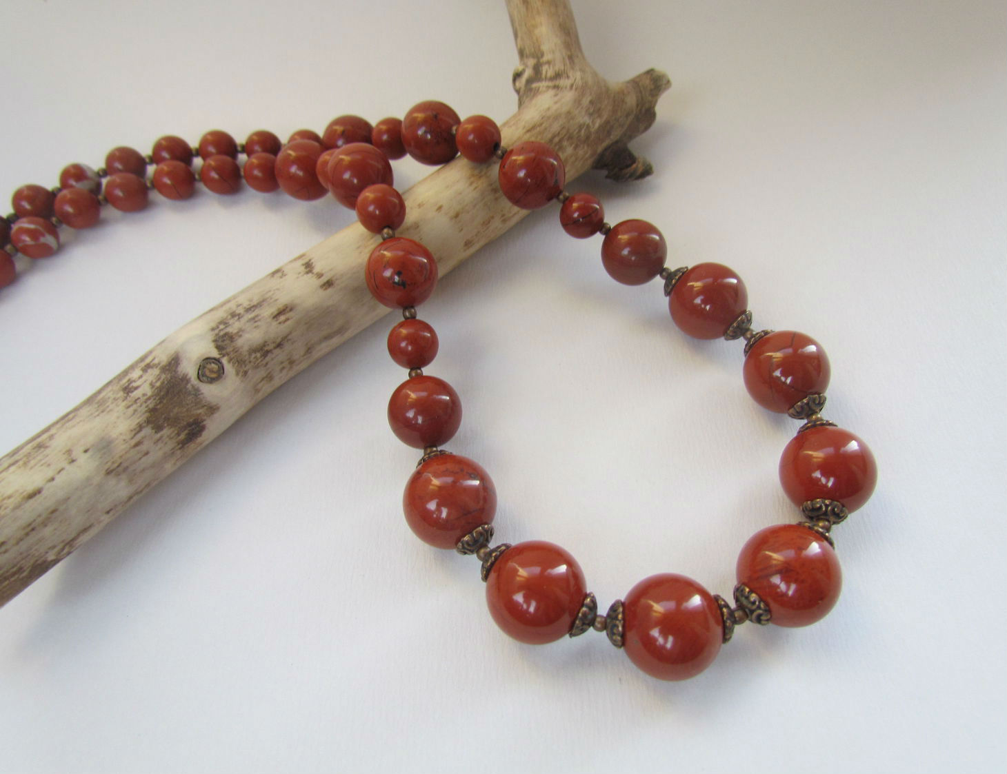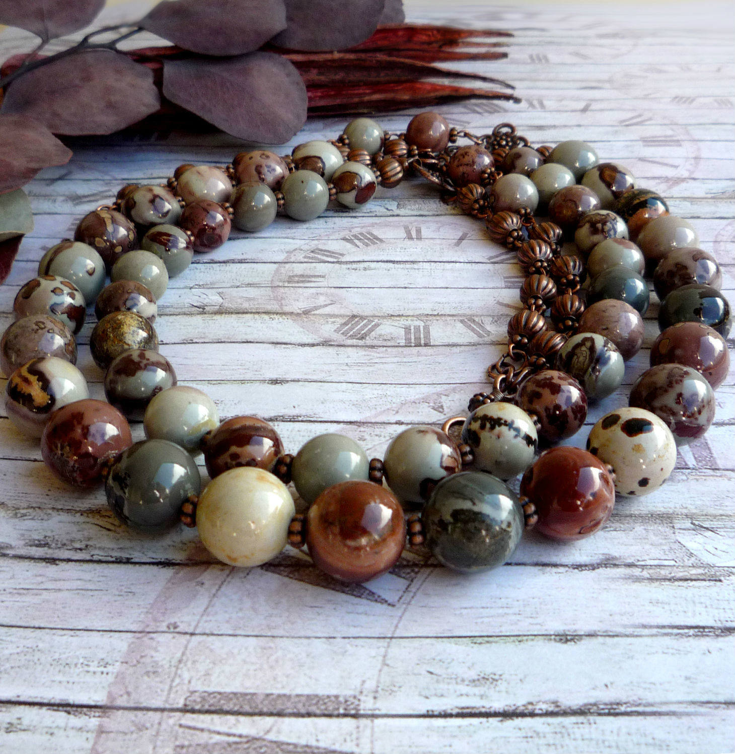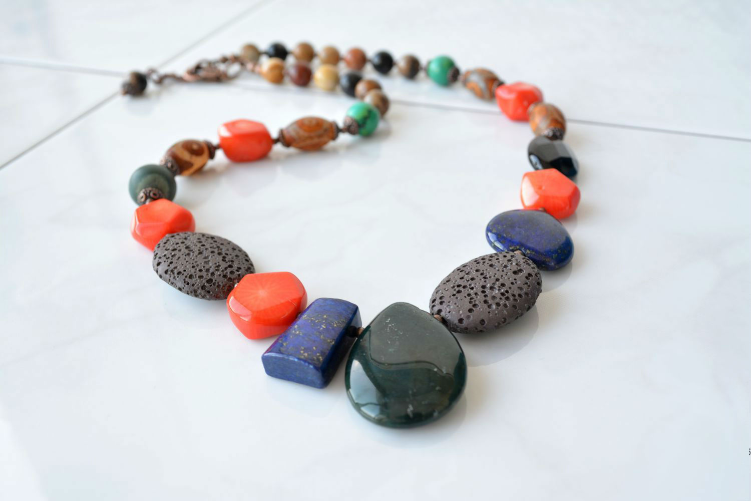 Beads, in which jasper is combined with other stones, look unusual and very textured. Such jewelry will harmoniously fill the open neckline area and, in combination with earrings from the same set, will add a zest to the image.