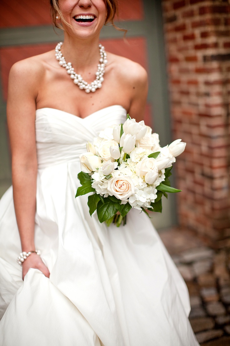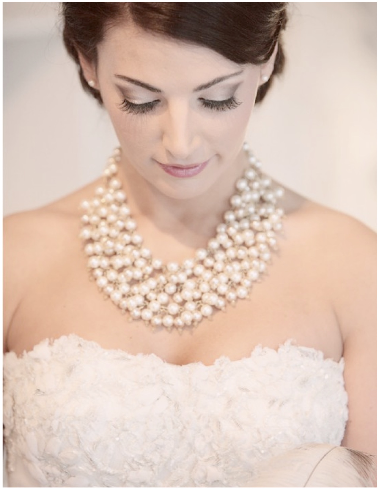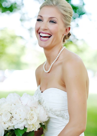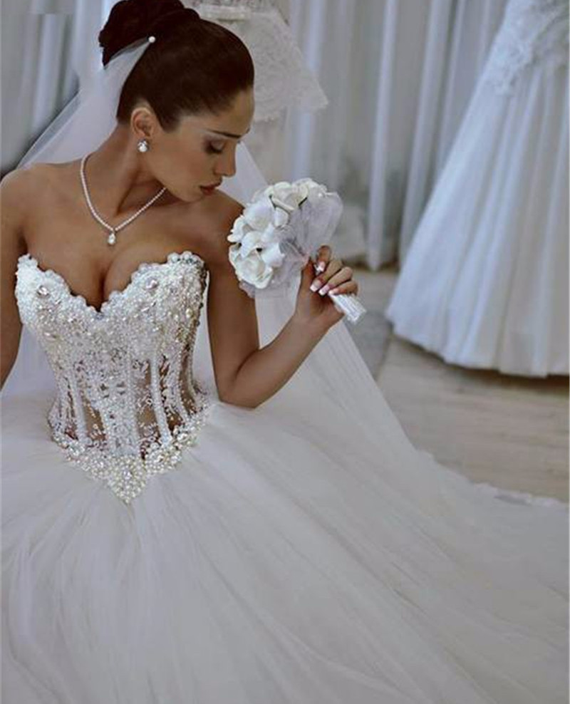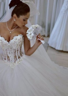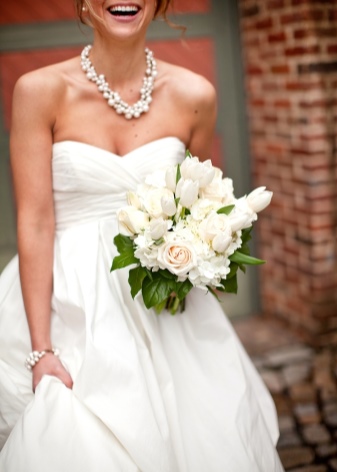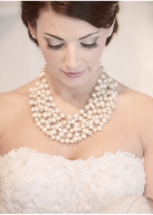 An excellent addition to the solemn image of the bride will be pearl beads. For a wedding dress under the chest, the decoration in several layers will harmoniously fill the open neck and will ideally fit into the girl's snow-white wedding dress.