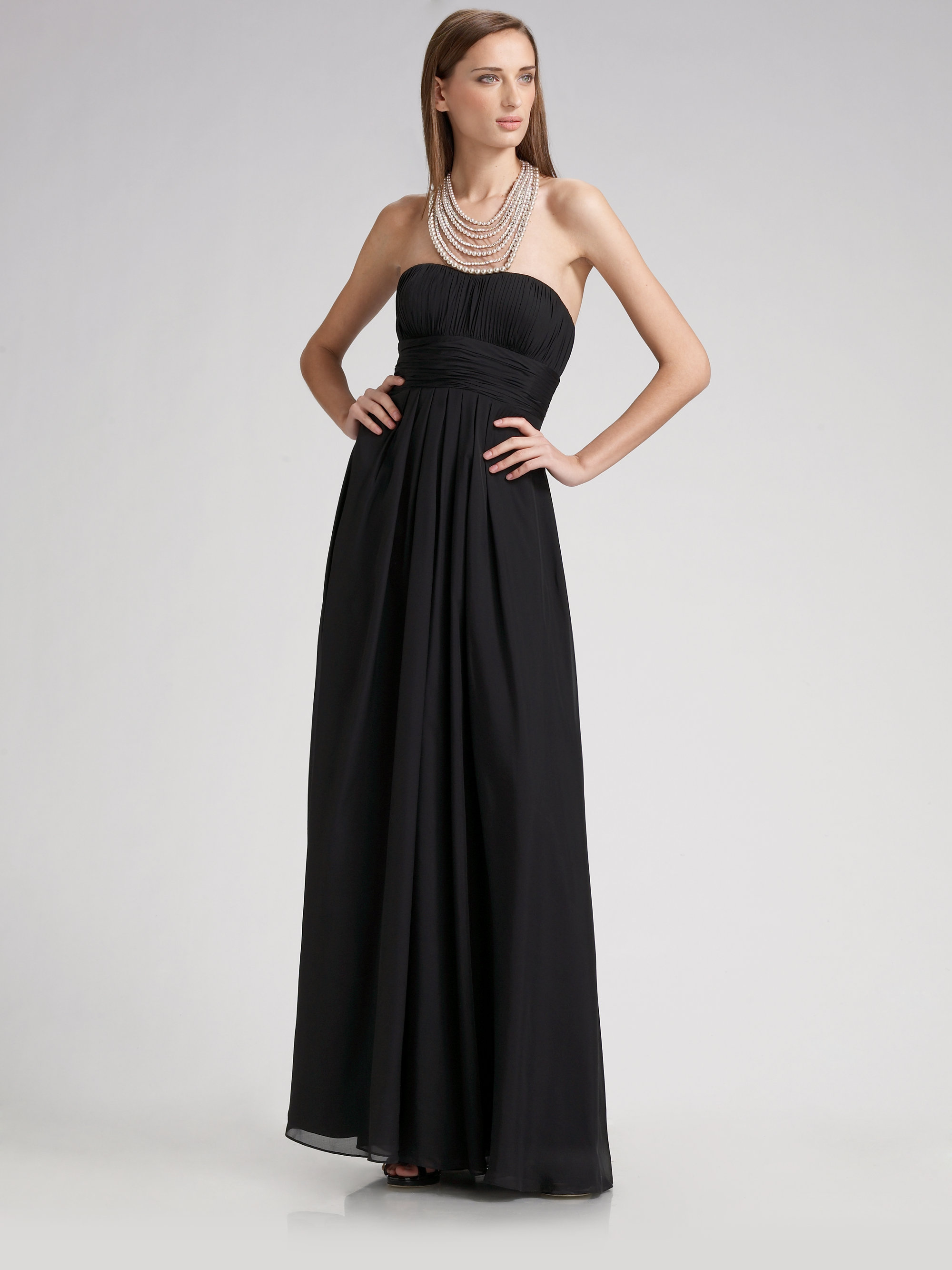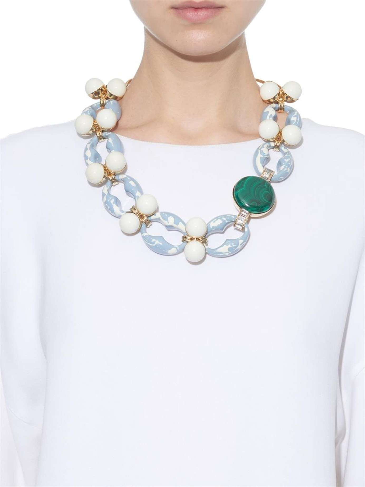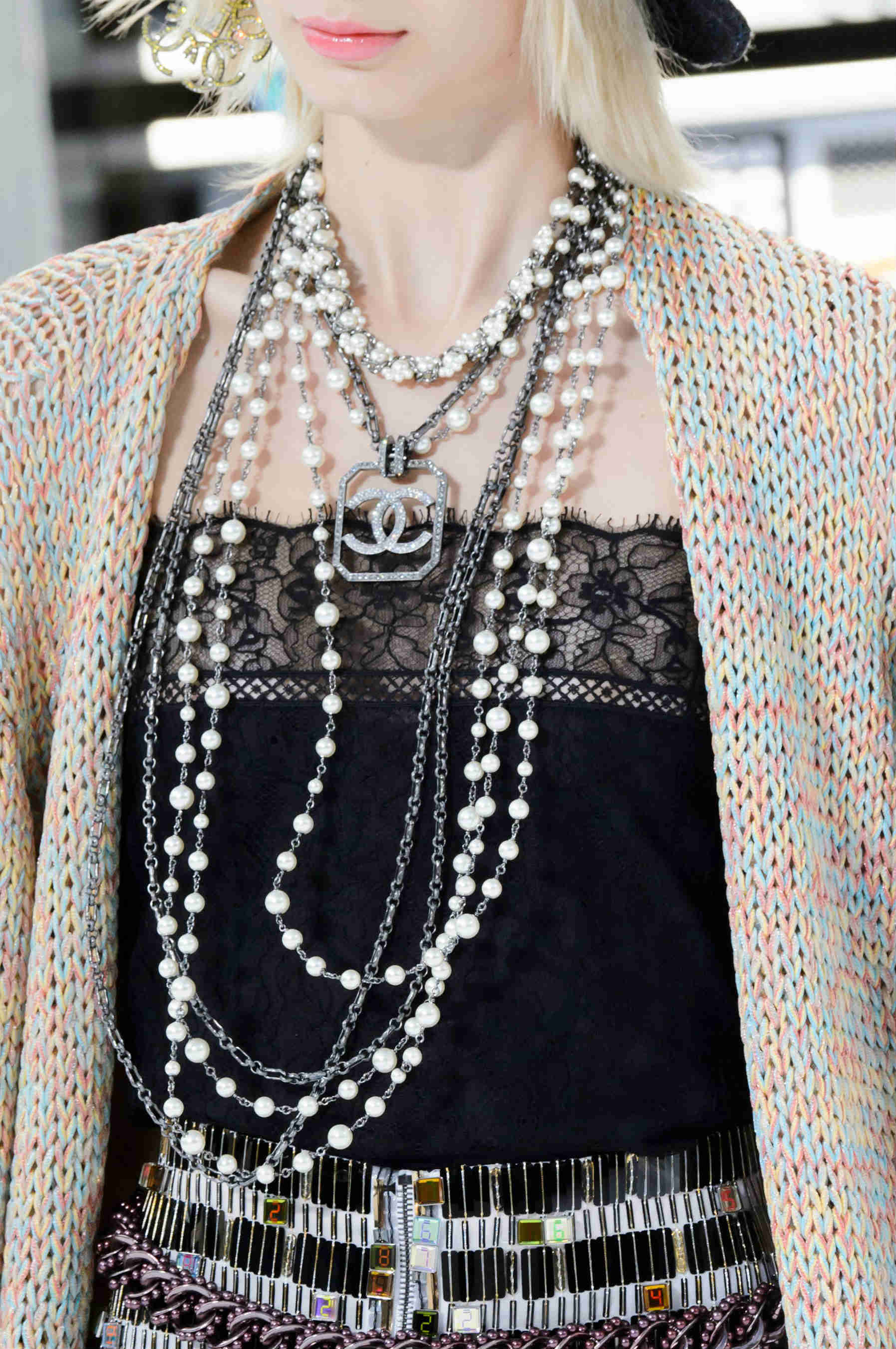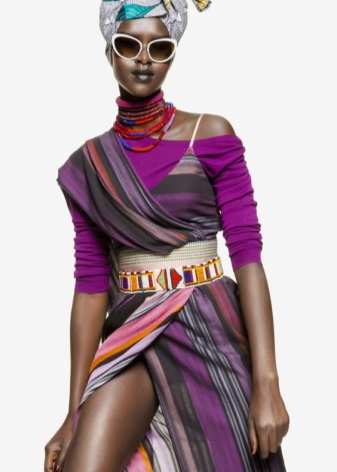 Organically and invoice look in the open area of the neckline necklaces of raw stones of different shapes and sizes. Particularly original look multi-row volumetric jewelry that will play a crucial role in the elegant evening look.