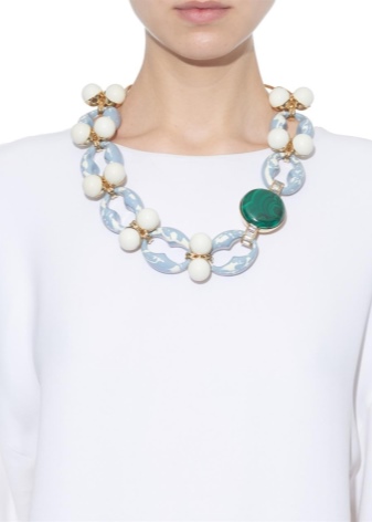 For clothes with a deep line of decolletes, necklaces of medium length can best be done. Regardless of the type of neckline, such decorations will harmoniously fit into an elegant female image.