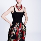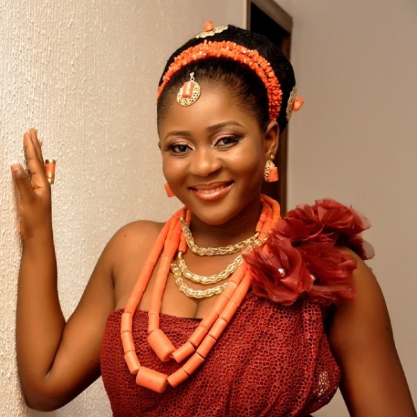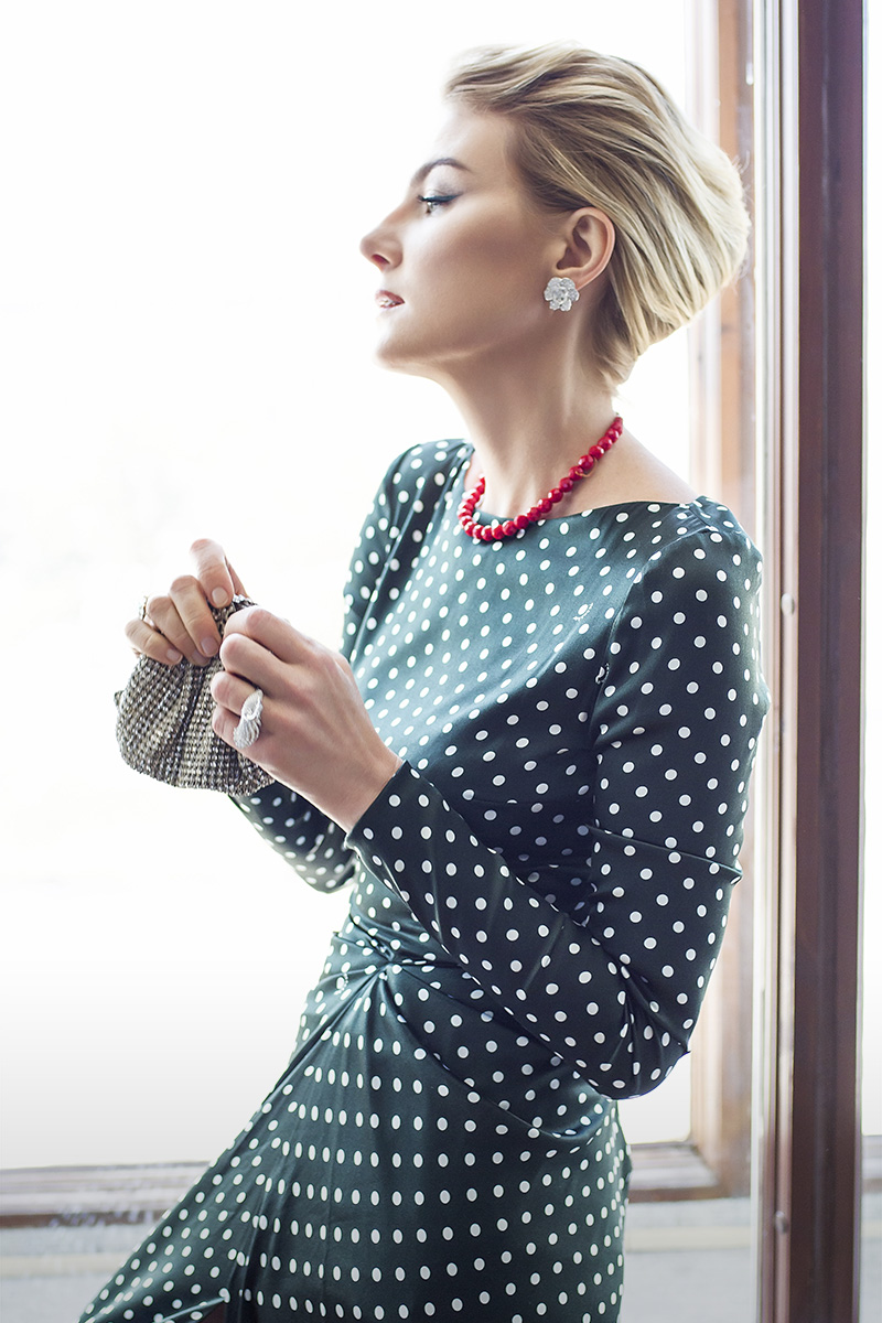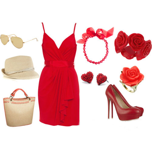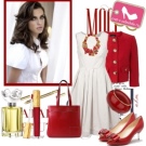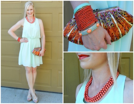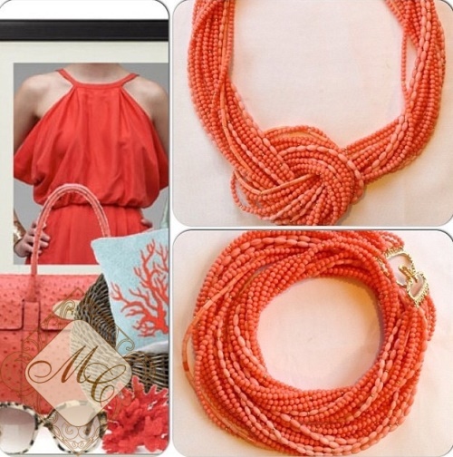 - Another summer look that is suitable for a solemn event, and for a party. A modest white chiffon dress is complemented by several strings of coral beads and a massive coral bracelet. Lipstick matched to the jewelry. The image is completed with a motley clutch embroidered with beads.