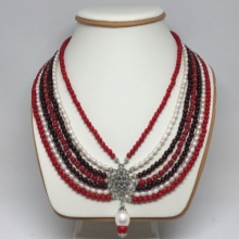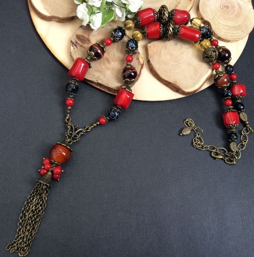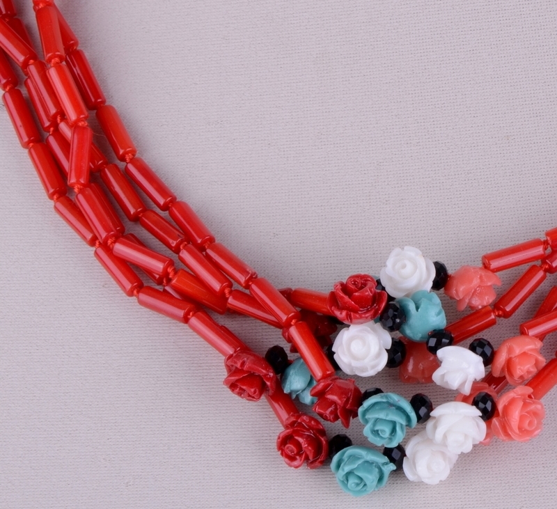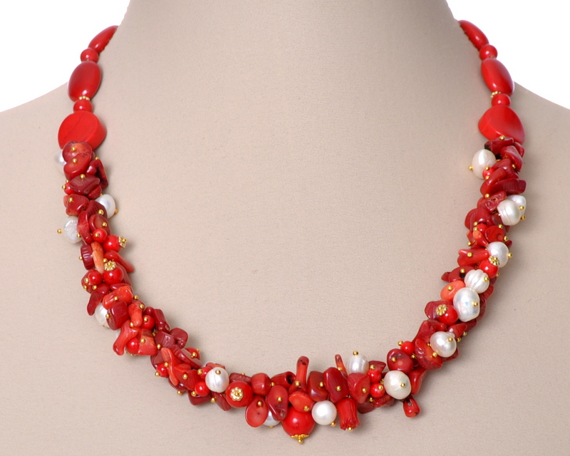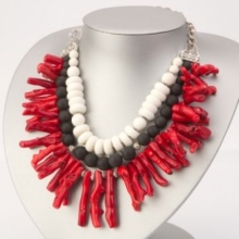 Red coral beads will be perfectly combined in the images made on the principle of the classic three - black, white and red.