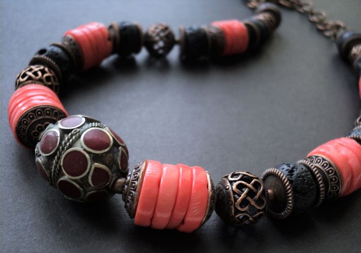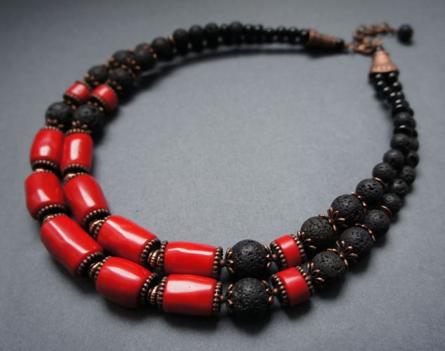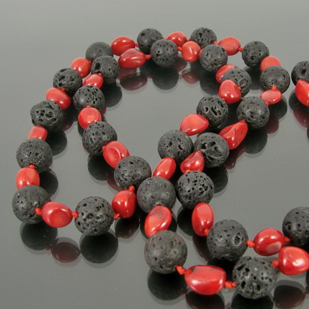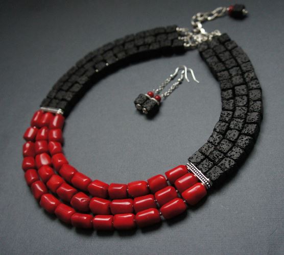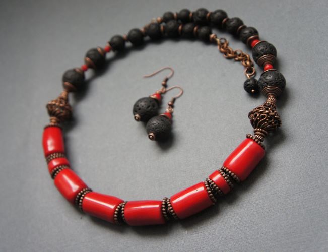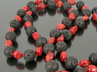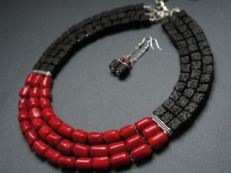 Volcanic lava in jewelry is a stone called basalt. With proper processing, it is perfectly combined with various gems. Especially spectacularly porous graphite matte stone looks with glossy red corals.