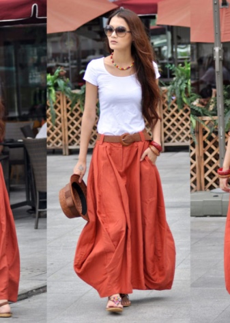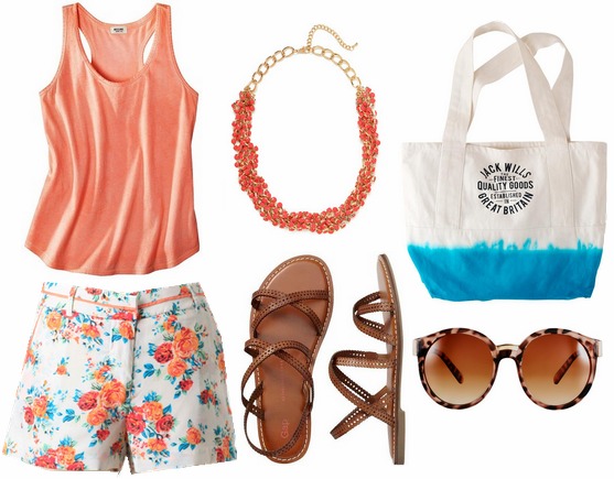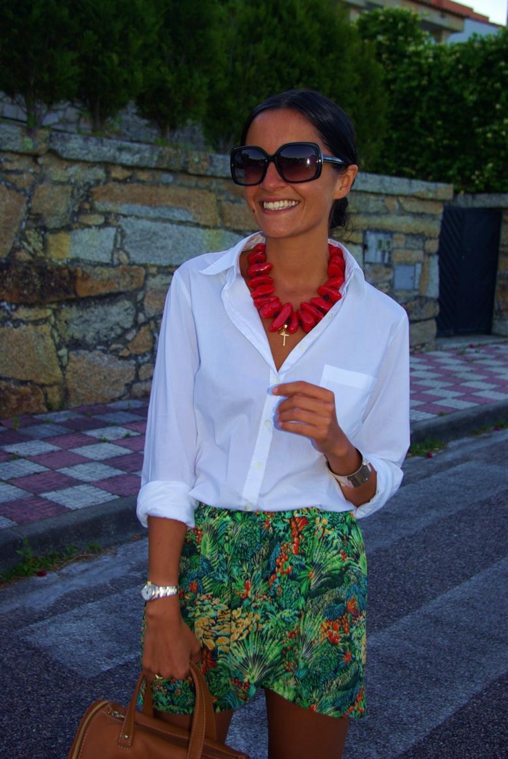- Light summer look: a relaxed white shirt, a short skirt with a tropical print, a volume brown bag, sunglasses and a bright accent of the image - massive coral beads. You can go to work if you are not required to comply with strict dress code, and in the evening go to a cocktail with friends.