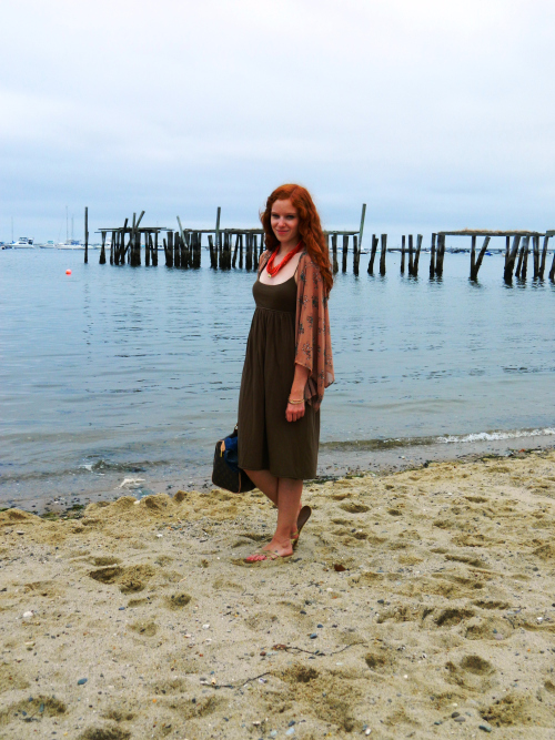 - Going on a sea voyage, give preference to a khaki sundress, throw a light chiffon kimono on top and complement the image with massive coral beads. So that you can walk around the coast a lot, choose comfortable sandals on a flat sole, and everything you need along the way will fit into a capacious bag.