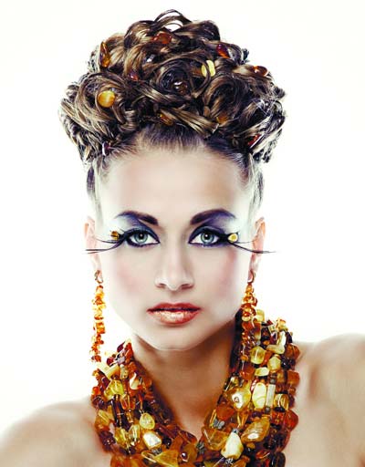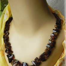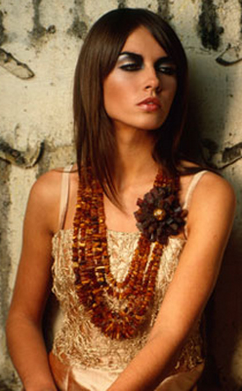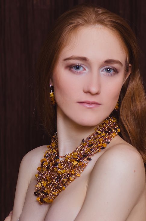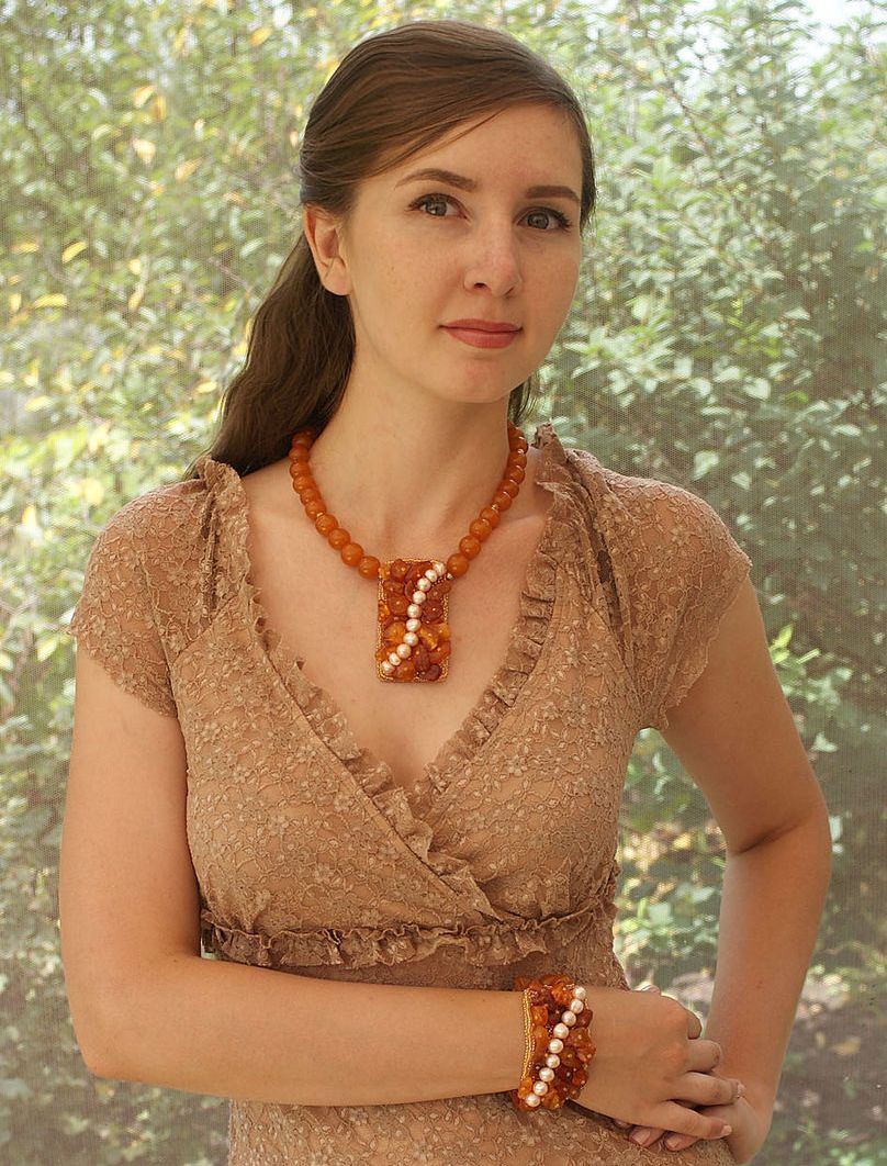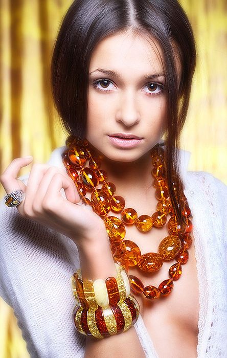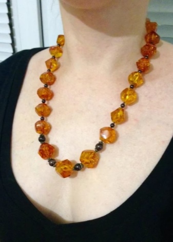 - A chic amber necklace will be a great addition to an orange evening gown. Especially effectively it will look on the owner of hair of chocolate or nut hue.