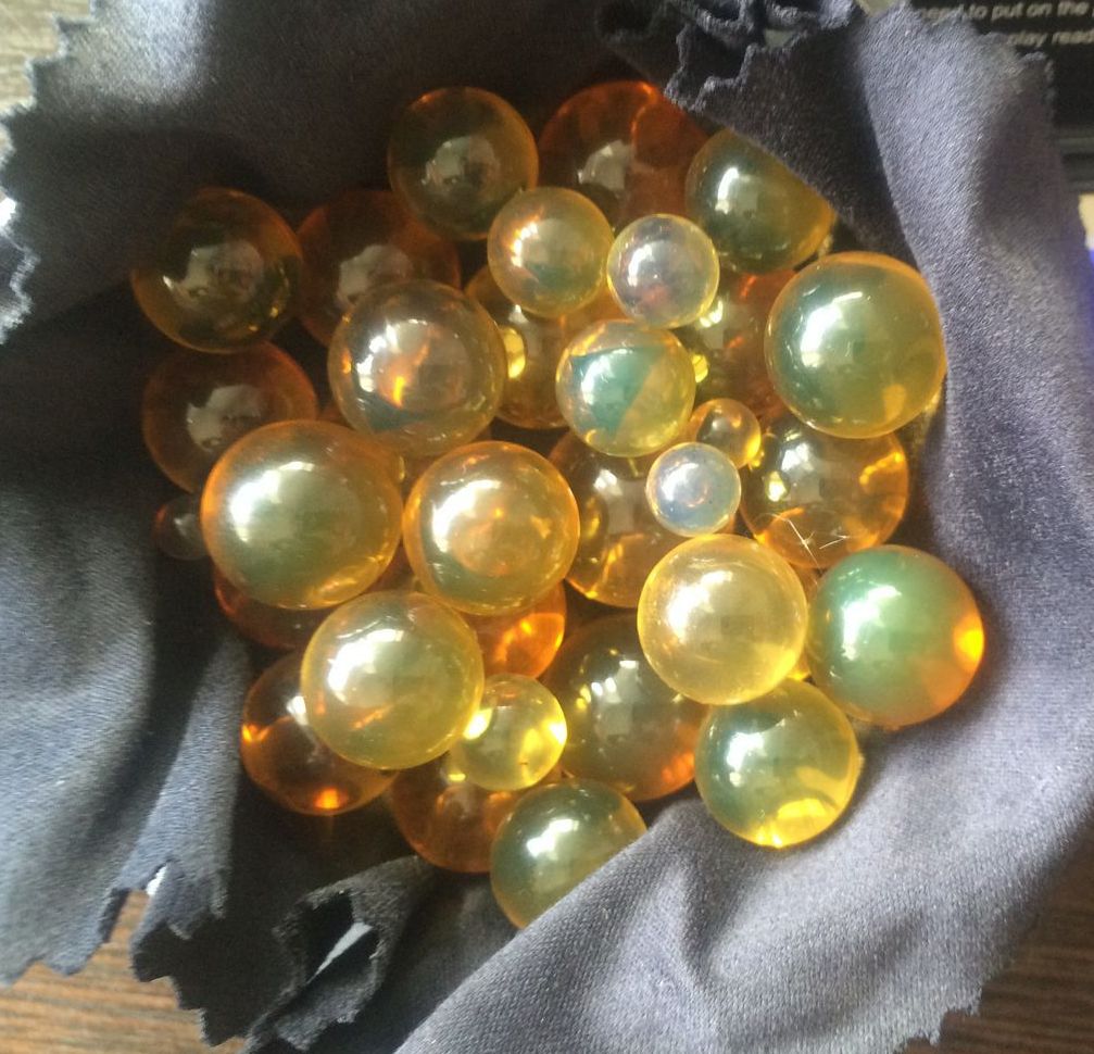 If the gem is left in its natural form, bubbles, voids, cracks and boundaries of resin layers are visible, which form a unique relief.