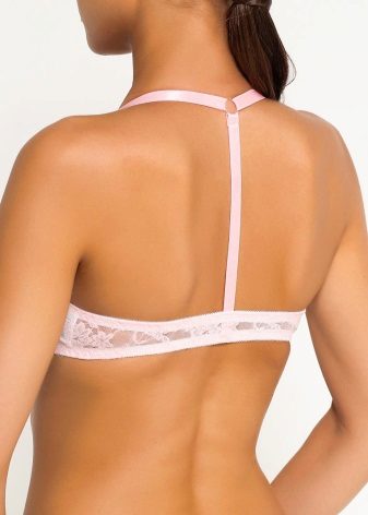 - T-back, or sweatshirt, is the name for the straps, connected to each other in the middle of the back. Their main advantage is that they do not constrain movements and do not fall down, forming a beautiful chest line. In addition, they are not visible under the sleeveless clothes;
