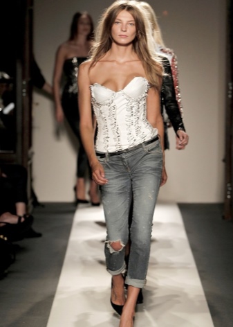 The feminine accessory will look very impressive with ordinary jeans. Upstairs you can throw a beautiful jacket or a cozy cardigan. It is worth remembering that wearing a corset without a cape (cardigan, jacket) is not recommended, otherwise you can create an overly vulgar image.