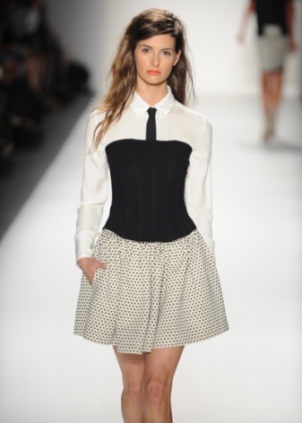 With charming bustiers, skirts with a high belt look very harmonious. The dress can have a free and airy or tight-fitting fit. If there is a hot summer outside, then you can choose a beautiful corset with a floral print and a plain skirt made of flowing fabrics.