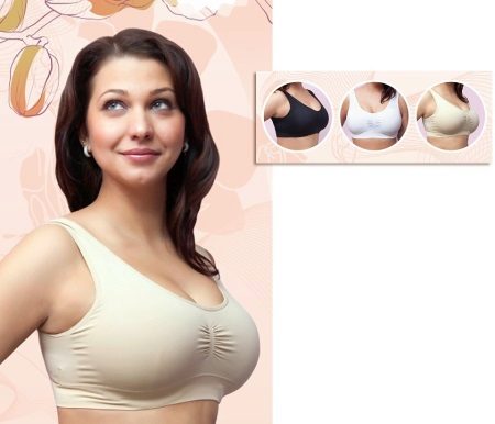 Bra "Orchid Bra". This corrective seamless underwear. Has the inserted cups. Due to the lower elastic band and cups, the breasts are always in excellent condition. Sconce is suitable for sports. Sold in a set of three pieces. For a stronger breast fixation, you can put on two bras at once. For example, for fitness. Can be washed in a washing machine at 40 degrees in a special bag.