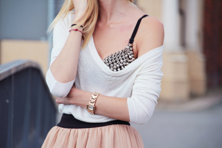 Studded bra is a bright accent and attracts attention. For this reason, it is not recommended to wear it along with leather jackets decorated with rivets and other metal décor. Bright things with a variety of prints, too, will not work, because on such a background the bra will simply not be noticeable. You should use calm colors in clothes: cream, white, beige.