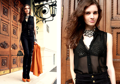 - Classic jacket and strict black pants. The ensemble is supplemented with a translucent blouse - the image will be very extravagant.