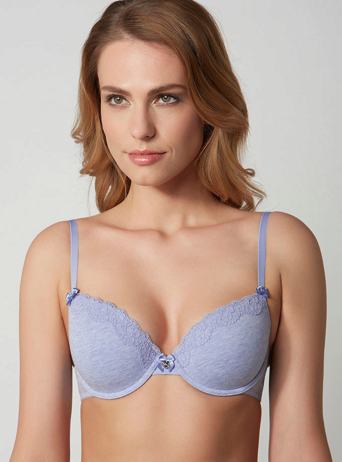 A model of a basic bra, made of elastic fabric and lace, decorated with a satin bow with a rose. This model is characterized by the presence of a small push-up.