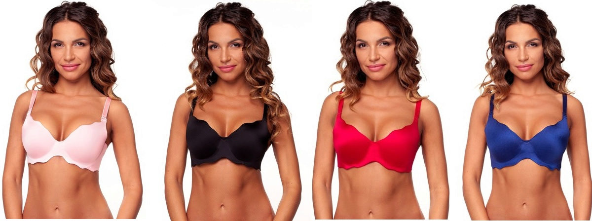 Basic seamless bra with a molded cup and a small seal on its bottom. It is available in several colors, including padding, white and beige. All cuts are processed curly seams - this allows the contours of the bra does not stand out.