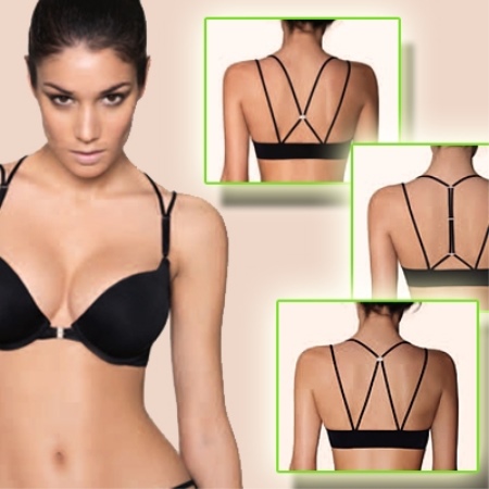 The transforming bra is indispensable for T-shirts, tops, sundresses, overalls with figured cuts on the back, decorations in the form of straps, ribbons, cross straps. In such cases, the underwear straps can also be fastened diagonally, widely spaced, lengthened or slung over the neck.