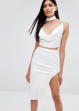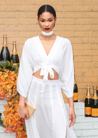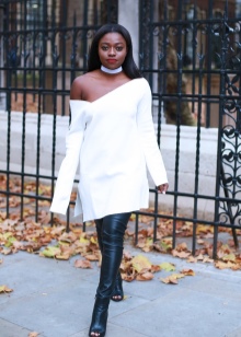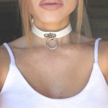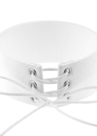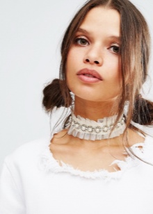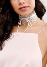 White choker perfectly decorate a business suit. This may be a strict classic, consisting of a jacket, blouse and pants. A model in the form of a thin cord made of genuine leather is perfect for such an image. Thanks to thin straps, the accessory can be twisted around the neck several times, and the loose ends are lowered. These styles are recognized today as fashion.