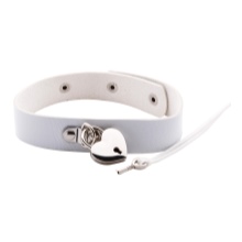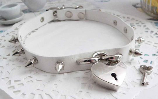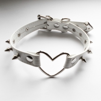 The clasp-pendant is very distinctive and often becomes the accent of a concise model. For example, a choker can be a strip of white genuine leather, and a clasp can be elements of a large chain with a metal clip-pendant. Such a lock is fastened to eyelets.