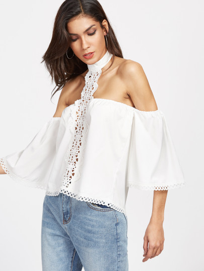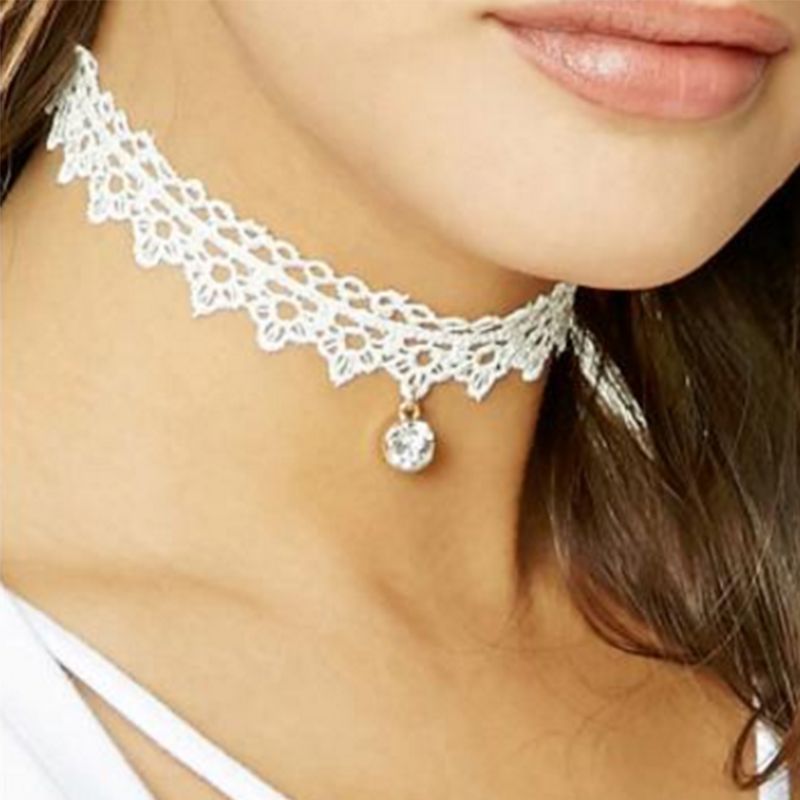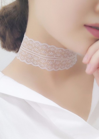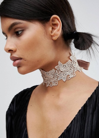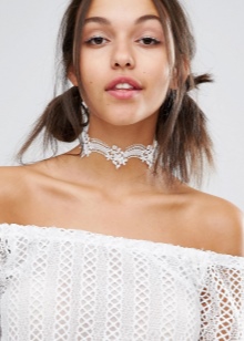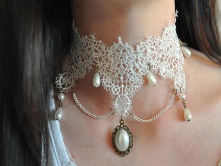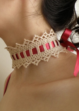 The necklace can be made of the finest threads, lace bands, knitted fabric. Width varies from very thin to wide. Often the style resembles the thinnest cobweb. Lace patterns are decorated with pearls in the form of beads or drops. Individual styles are decorated with satin colors of pastel shades, rhinestones, sparkling crystals or framed stone.