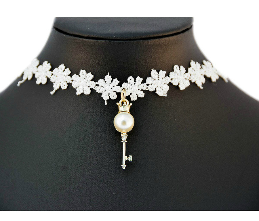 In addition to the usual options with a chain, the version with a lock key decorated with a pearl and a small crown over the bead looks very unusual. Usually, if the necklace has an unusual fastener, it has a simpler design and a small width. It can be a strip of tiny flowers or a crocheted pattern with the addition of beads.