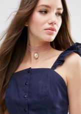 If a girl has a long swan neck, then you can safely wear a wide openwork choker. Such jewelry is often decorated with rhinestones, pearls or beads of various sizes. Also tapes can be supplemented with one or more pendants. Since ancient times, it was fashionable to decorate wide ornaments on the neck with one big stone in the middle. This small dress will add a vintage touch to the look.