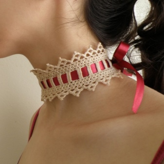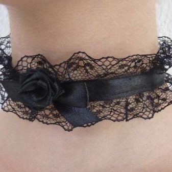 Some choker collars consist of several colors or textures. For example, the thin satin ribbon taken as a base complements black lace. Such an accessory in combination with evening dress will create a stunning bow.