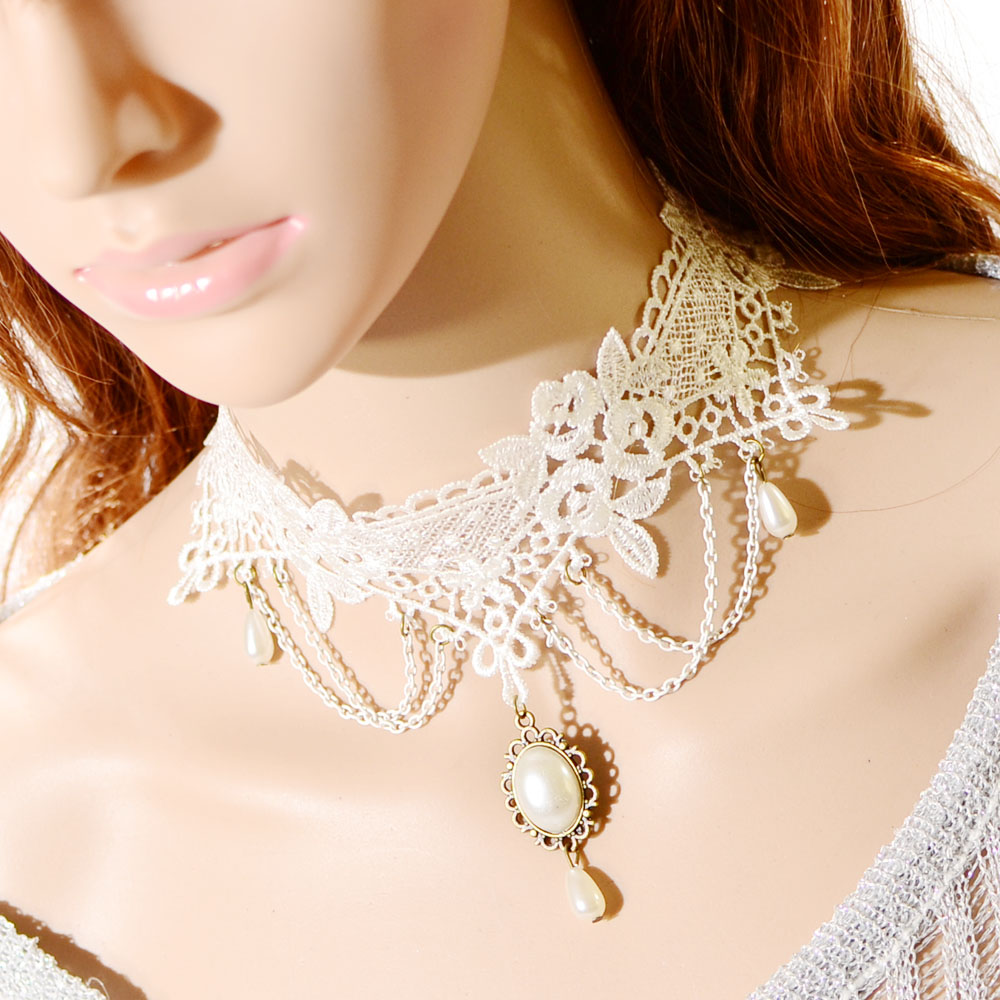 White openwork collar causes no less effect. It gives the image of lightness and romanticism. Light lace is especially suited to the wedding dress. The necklace can be complemented with a small scattering of pearls or beads. With this decoration the image of the bride will be unique.